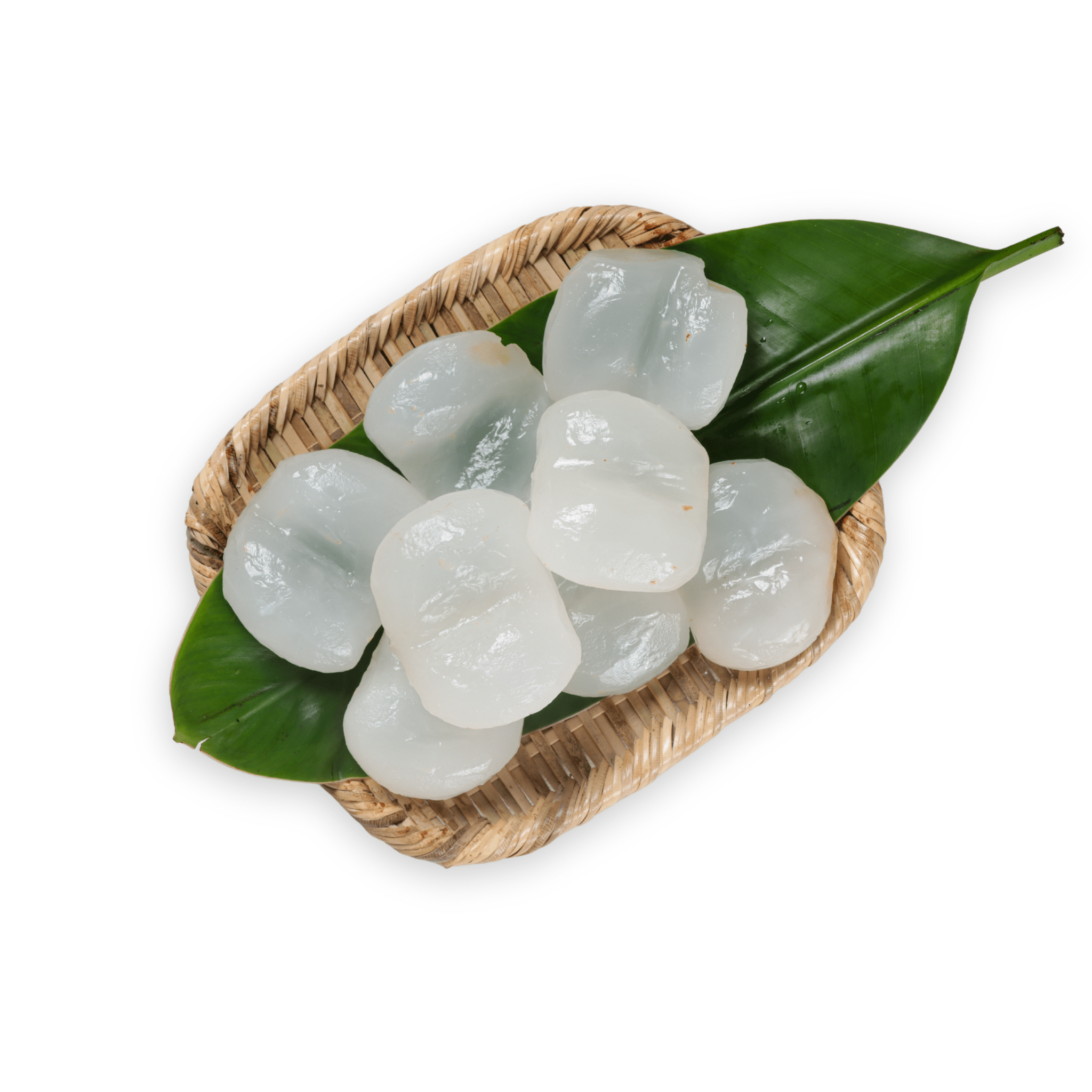 It is translucent and pale white in colour and resembles a lychee in texture but has the taste of a very sweet and tender coconut.